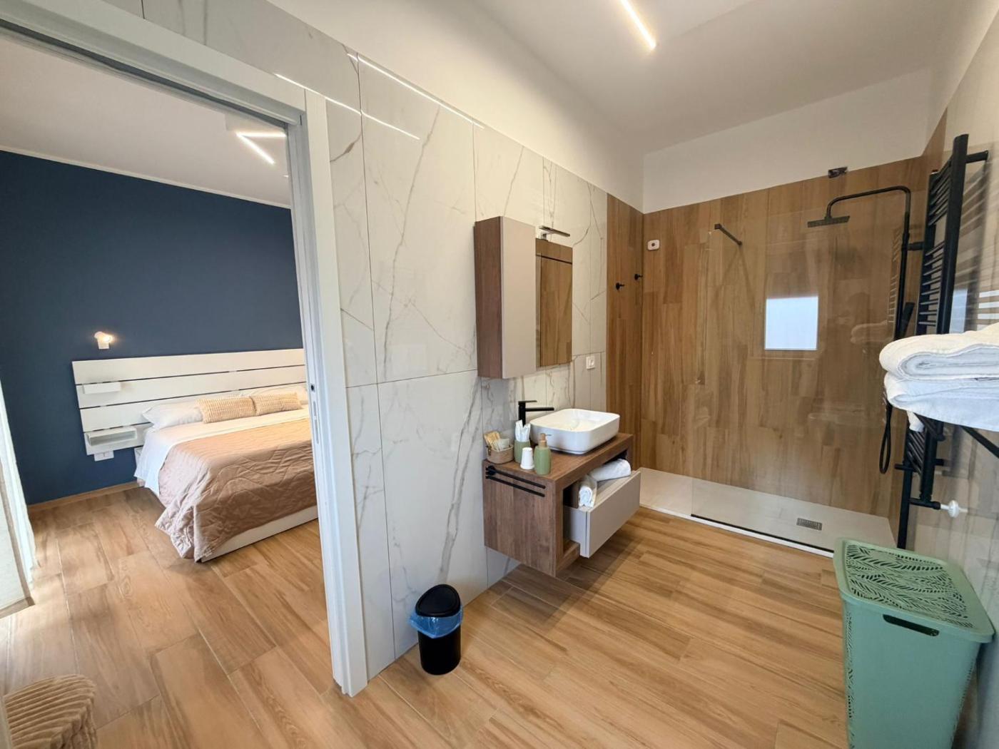 Camera Matrimoniale Deluxe con Balcone e Vista Mare. Spaziosa e climatizzata, la camera matrimoniale dispone di ingresso indipendente, terrazza affacciata sul giardino e bagno privato con doccia a filo pavimento. L’alloggio presenta 1 letto.